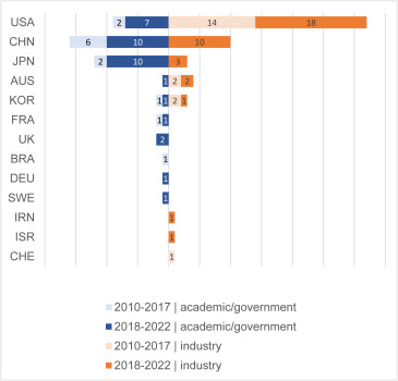 各國(guó)之間存在明顯差異。在美國(guó),行業(yè)贊助的試驗(yàn)數(shù)量超過學(xué)術(shù)/政府贊助的試驗(yàn)(分別為32項(xiàng)和9項(xiàng)),甚至在2018年之前就具有很強(qiáng)的代表性,而中國(guó)和日本僅在過去5年內(nèi)才開始有行業(yè)贊助的試驗(yàn),并且由于強(qiáng)大的國(guó)家資助計(jì)劃,他們的大部分試驗(yàn)仍然主要由學(xué)術(shù)/政府贊助(袁等,2012;‘江之澤,2022年;李2022)。