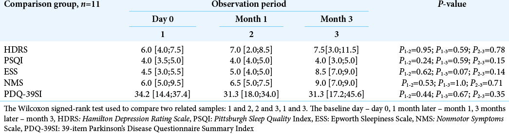 治療的有效性也通過(guò)NMS量表進(jìn)行評(píng)估。第0天 (Me=8.0 [6.0; 13.5]) 和第3個(gè)月 (Me=7.0 [6.0; 10.5]) 之間 PD非運(yùn)動(dòng)表現(xiàn)總數(shù)有減少的趨勢(shì) [表格1] 也被揭曉。相比之下,對(duì)照組患者在同一觀察期間表現(xiàn)出癥狀加重的趨勢(shì)[表3]。