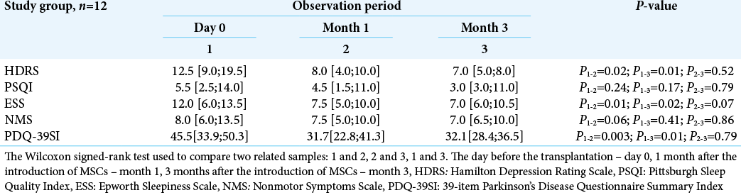 我們發(fā)現(xiàn)治療前的MDSUPDRS評(píng)分(第III部分)(Me=36.5[30.0; 57.5])與治療后第1個(gè)月的評(píng)分(Me =33.5[26.0; 52.5])之間存在統(tǒng)計(jì)學(xué)顯著差異(P=0.02 )。在學(xué)習(xí)小組期間。差異達(dá)9%。移植后所取得的結(jié)果維持3個(gè)月(Me=32.0 [23.0; 40.0])。在治療期間,治療前評(píng)分 (Me=20.0 [15.5; 34.0]) 和第1個(gè)月 (Me = 22.0 [14.5; 31.0])、( P=0.18) 以及第1個(gè)月和第1個(gè)月之間的評(píng)分差異有統(tǒng)計(jì)學(xué)意義3(Me=19.0 [15.0; 31.0],[ P=0.2])未檢測(cè)到。