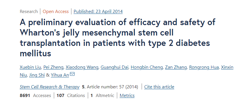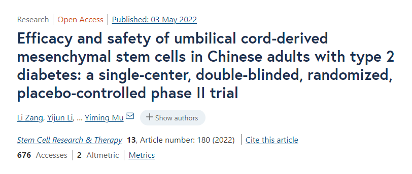 此外,解放軍總醫(yī)院內(nèi)分泌科母義明教授、生物治療中心韓衛(wèi)東教授等人也在Stem Cell Res Ther期刊上發(fā)表了一項單中心、隨機、雙盲、安慰劑對照試驗的結(jié)果,考察了臍帶間充質(zhì)干細胞治療2型糖尿病的有效性和安全性。
