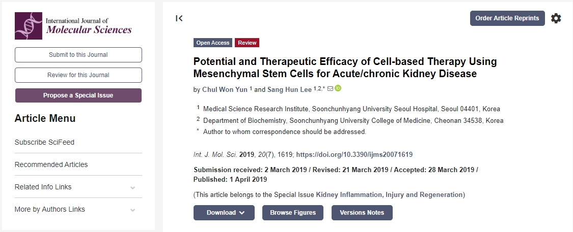 2019年,韓國順天鄉(xiāng)大學(xué)首爾醫(yī)院在《國際分子科學(xué)雜志》發(fā)布了一篇使用“間充質(zhì)干細胞治療急性/慢性腎臟病的潛力和治療效果”的論文,這篇綜述討論了最近與腎臟疾病相關(guān)的實驗和臨床發(fā)現(xiàn),重點討論了間充質(zhì)干細胞在腎臟疾病的療效和臨床應(yīng)用。