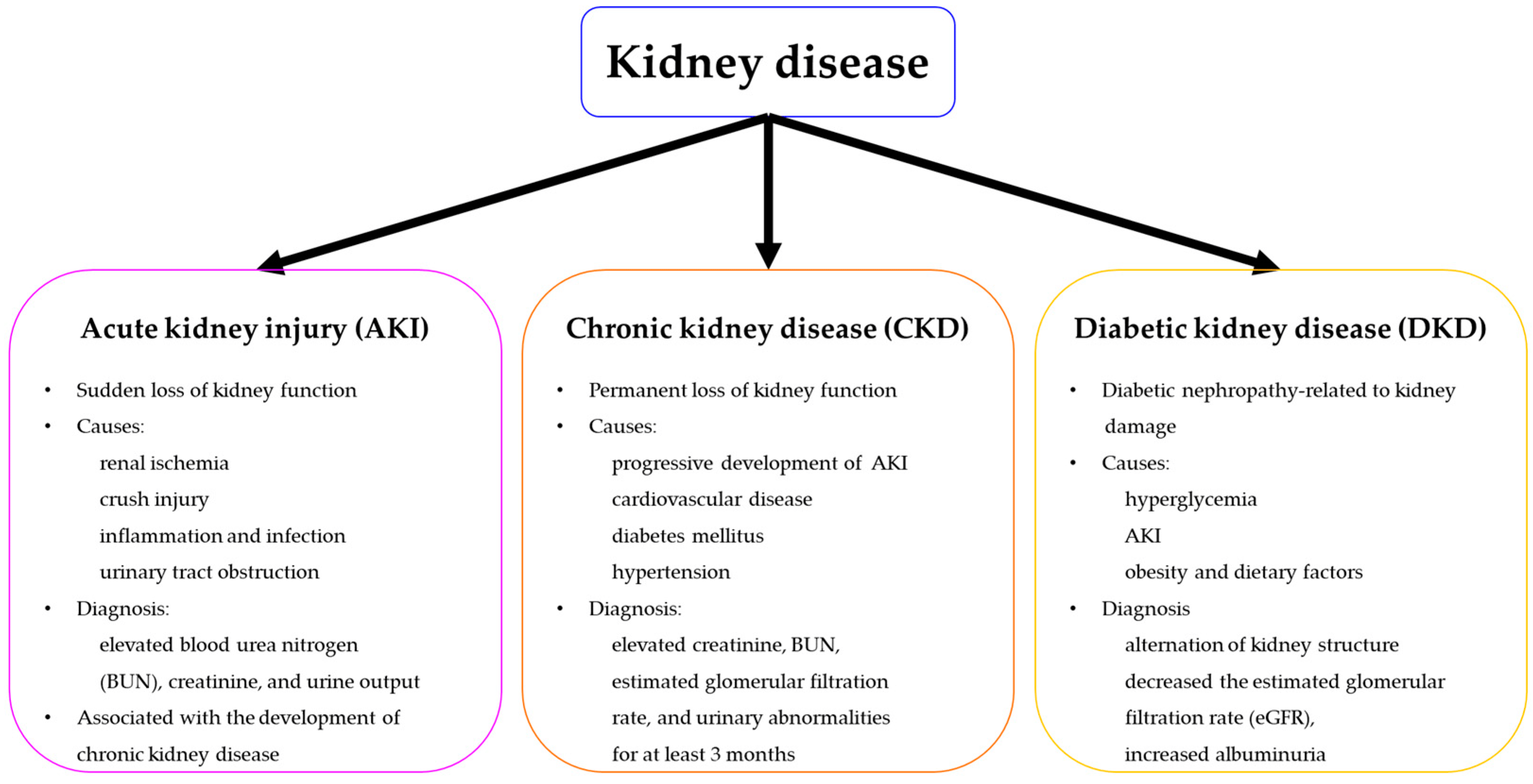 急性腎損傷(AKI):其特征是突發(fā)性腎衰竭或腎功能迅速喪失。AKI有許多潛在原因,包括低血壓引起的腎缺血、擠壓傷、炎癥和尿路梗阻或感染。它是根據(jù)升高的血尿素氮 (BUN) 和肌酐濃度,或減少尿量來診斷的。