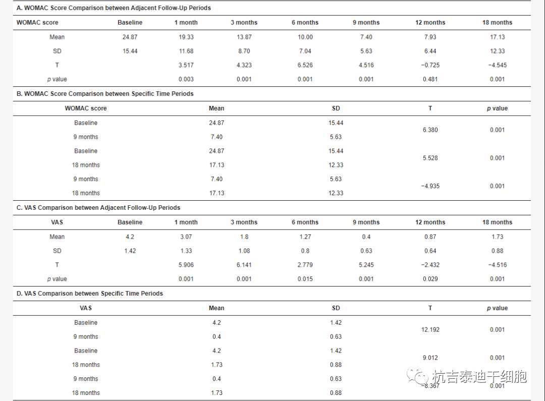 該研究最重要的發(fā)現(xiàn)是膝關(guān)節(jié)OA患者單次關(guān)節(jié)內(nèi)注射MF-AT可獲得令人滿意的臨床結(jié)果和功能改善,在18個月的隨訪中沒有發(fā)生不良事件,患者表現(xiàn)最好注射后9個月膝關(guān)節(jié)功能改善