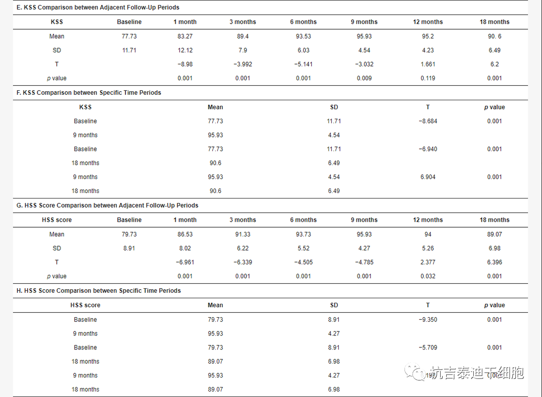 KSS和HSS分?jǐn)?shù):經(jīng)過18個月的隨訪,患者的KSS從77.73±11.71提高到90.6±6.49,HSS評分從79.73±8.91提高到89.07±6.98。注射前和注射后18個月的評分之間存在顯著差異(p<0.05,如表2?(E–H) 和圖3所示)。