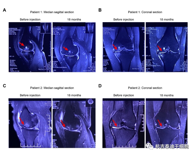 四十個膝蓋中的二十八個在注射前為RechtII級,十二個為RechtIII 級。注射后18個月,8例為RechtI級,22例為RechtII級,10例為 RechtIII級。Recht評分提高率為25%。在補充圖S1中,列舉了兩名患者在接受關(guān)節(jié)內(nèi)注射MF-AT之前和之后的MRI結(jié)果。在冠狀面和矢狀面上,我們可以看到與應(yīng)用MF-AT之前相比,膝關(guān)節(jié)水腫略有減輕,但軟骨再生不明顯。
