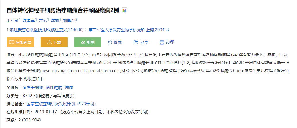 [3]:王亞莉,陳國(guó)軍,方鳳,等. 自體轉(zhuǎn)化神經(jīng)干細(xì)胞治療腦癱合并頑固癲癇2例[J]. 臨床薈萃,2012,27(11):993-994.