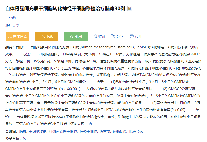 [7]:王亞莉. 自體骨髓間充質(zhì)干細(xì)胞轉(zhuǎn)化神經(jīng)干細(xì)胞移植治療腦癱30例[D]. 浙江:浙江大學(xué),2016.
