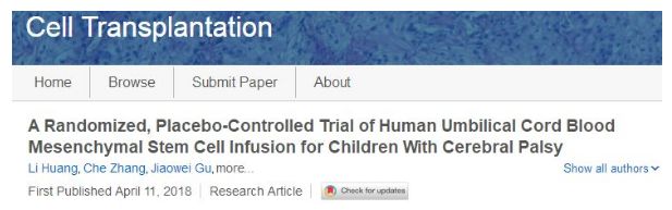 2018年,西安交通大學(xué)醫(yī)學(xué)院神經(jīng)生物學(xué)研究所呂海俠教授在細(xì)胞移植期刊(Cell Transplantation)上發(fā)表了一篇研究成果。通過隨機(jī)、安慰劑對(duì)照的臍帶血間充質(zhì)干細(xì)胞輸注治療腦癱患兒,結(jié)果顯示臍帶血治療組患兒的癥狀改善程度顯著優(yōu)于對(duì)照組。證實(shí)臍帶間充質(zhì)干細(xì)胞治療腦癱安全且效果顯著。