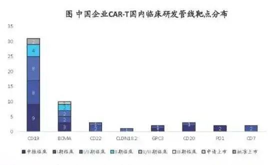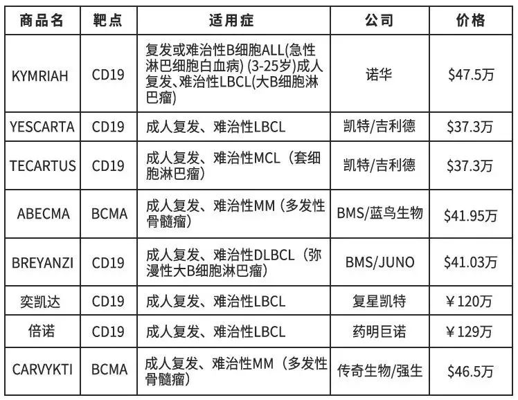 國內(nèi)已批準復星凱特、藥明巨諾2款靶向于CD19的CAR-T療法、而信達生物/馴鹿醫(yī)療的BCMACAR-T療法正在申請上市,此外美國已批準傳奇生物開發(fā)的BCMACAR-T。