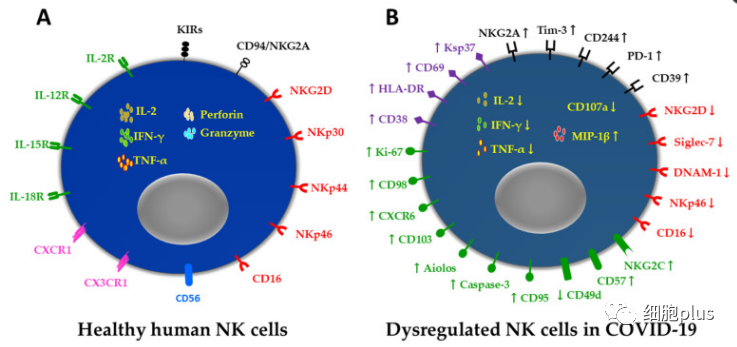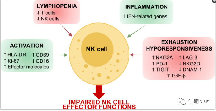 由于局部和全身炎癥,新冠肺炎患者中的NK細(xì)胞的特征在于歸因于細(xì)胞活化和炎癥以及細(xì)胞衰竭和低反應(yīng)性的信號(hào)。NK細(xì)胞表型的這些改變決定了在IFN-γ和TNF-α產(chǎn)生、脫粒溶細(xì)胞潛力和控制病毒復(fù)制能力方面NK細(xì)胞效應(yīng)子功能的損傷。