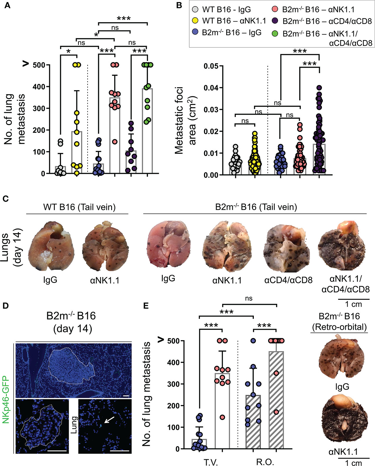 在本項研究中,作者利用B16轉(zhuǎn)移性黑色素瘤模型來證明NK細胞如何與T細胞合作來減少肺部轉(zhuǎn)移性腫瘤負擔。