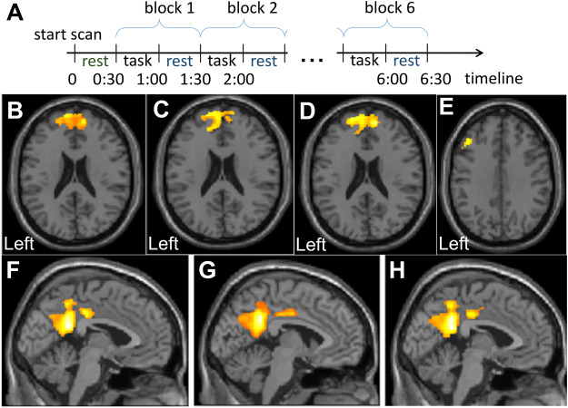 (A)fMRI 數(shù)據(jù)共分為6個區(qū)塊,每個區(qū)塊由雙任務和休息期組成。 丟棄第一個休息期(綠色表示)以確保達到T1平衡。 (B)治療前患者左額葉皮質(zhì)的失活區(qū)-言語工作記憶環(huán)路前部成分的一部分。 失活簇包括Brodmann區(qū)9和10。(C) 干細胞注射后患者左右額葉皮質(zhì)的失活區(qū)和(D)相應的差異圖像顯示失活體積顯著減少(P?<0.001)。(E) 治療后,Brodmann 區(qū) 9 的部分額葉皮質(zhì)變?yōu)榧せ顓^(qū)。(F)左后扣帶回左側邊緣葉失活區(qū)治療前和治療后(G)體積均無變化(P?>0.05)。(H)然而,差值圖像顯示其定位發(fā)生了變化。