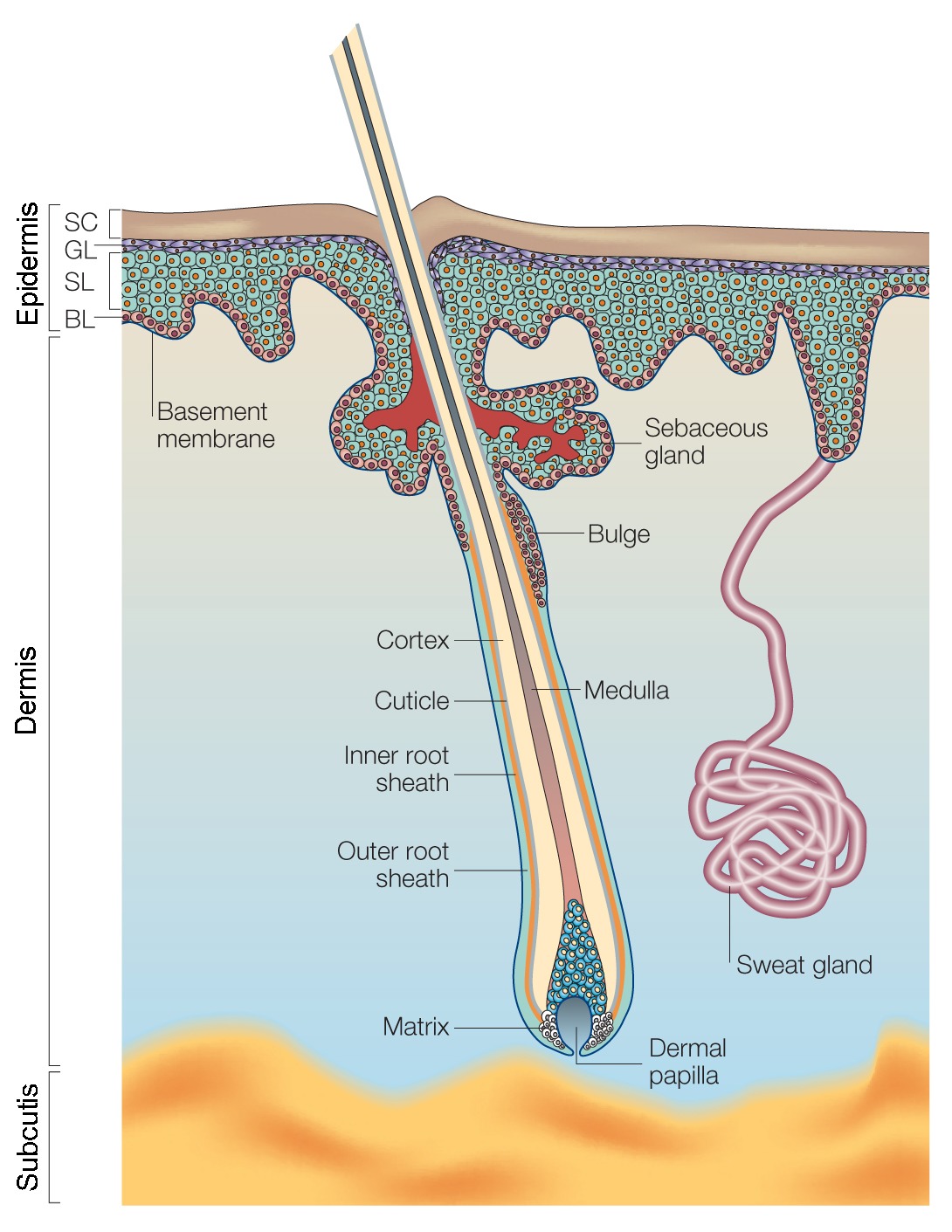 Skin structure diagram adapted by permission from Macmillan Publishers Ltd: Nature Reviews Genetics 3, 199-209 (March 2002), Getting under the skin of epidermal morphogenesis, Elaine Fuchs & Srikala Raghavan; doi:10.1038/nrg758; Copyright 2002.
