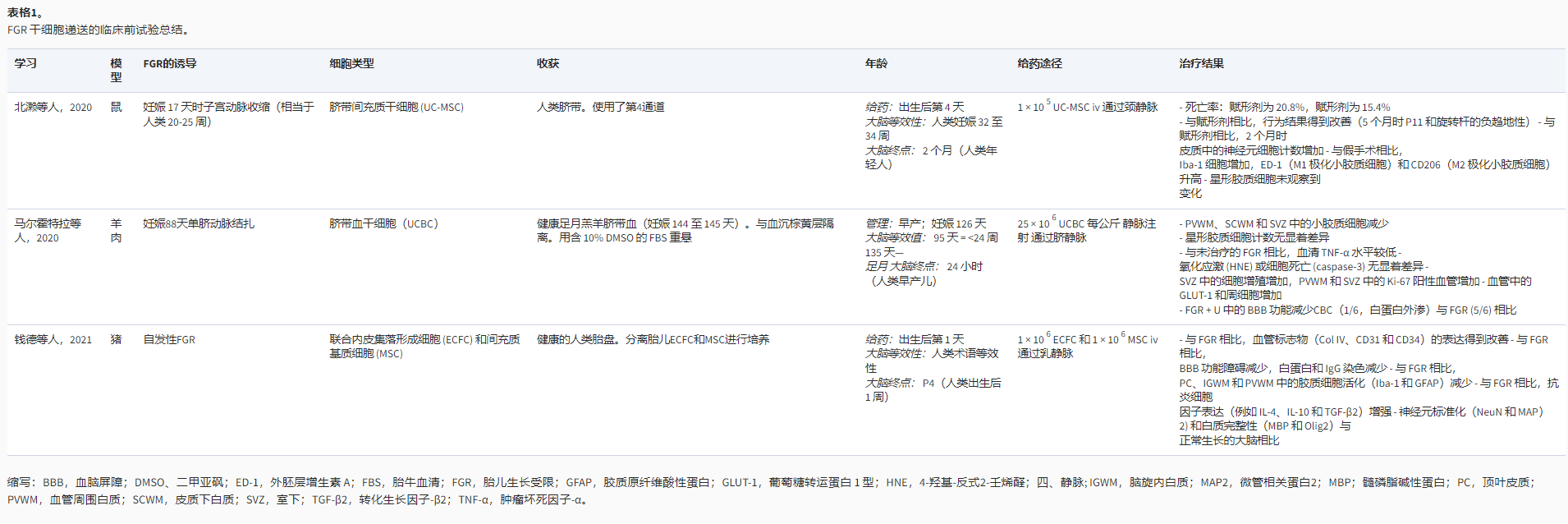 除了缺乏FGR嬰兒的臨床試驗(yàn)外,臨床前動(dòng)物模型研究也有限,迄今為止發(fā)表的研究?jī)H有3篇(表1)。這些研究,包括FGR大鼠模型和2項(xiàng)大型動(dòng)物研究,顯示出有希望的神經(jīng)保護(hù)結(jié)果,報(bào)告了大腦干細(xì)胞治療后的多區(qū)室益處。