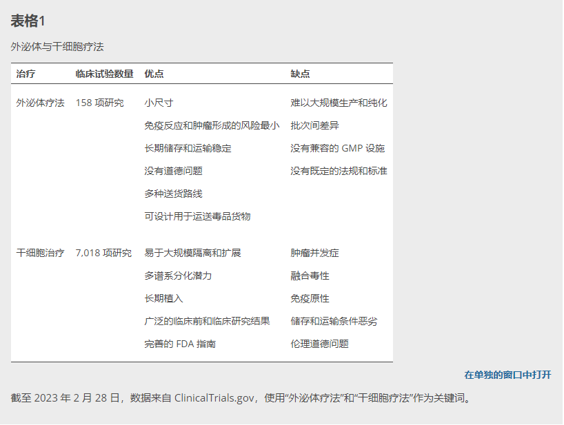 至少有150項臨床試驗已在ClinicalTrials.gov上注冊,研究基于外泌體的療法治療多種疾病,包括呼吸道疾病、傳染病和癌癥(在 www.clinicaltrials.gov上使用“外泌體療法”作為關(guān)鍵詞搜索)。在這些試驗中,31項應(yīng)用源自干細(xì)胞(主要是來自不同組織的間充質(zhì)干細(xì)胞)的外泌體,并作為間充質(zhì)干細(xì)胞療法的替代方案進(jìn)行測試。這些臨床前和臨床研究表明,干細(xì)胞釋放的外泌體可能部分重現(xiàn)其供體細(xì)胞的治療效果,而沒有干細(xì)胞治療固有的缺點(表1)。