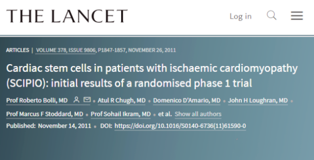 2011年11月,國(guó)際醫(yī)學(xué)期刊《柳葉刀》報(bào)道了世界第一例接受干細(xì)胞治療心臟病的臨床試驗(yàn)。65歲的邁克·瓊斯(Mike Jones)患有充血性心力衰竭(congestive heart failure),2009年7月,瓊斯成為世界上第一位接受干細(xì)胞移植療法的心力衰竭病人。