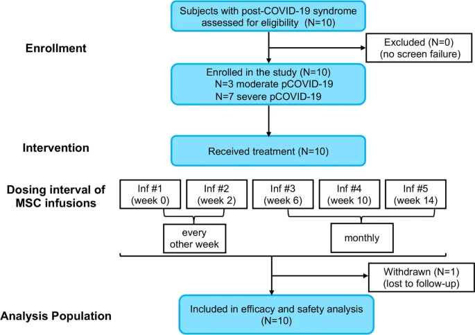 方法:十名符合條件的患有COVID-19后綜合癥的受試者參加了為期40周的計劃,他們在第0、2、6、10和14周分別接受5次靜脈輸注2×108自體HB-adMSC,并進行隨訪在第18周開始,在第40周研究結(jié)束。