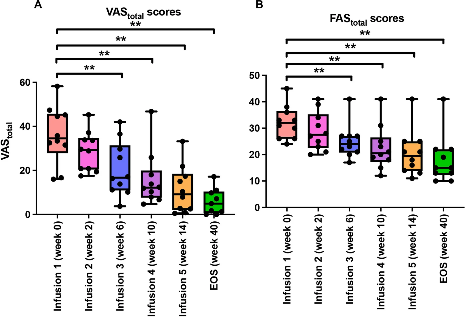 圖2:VAS總分和FAS總分。與基線相比, VAS總分和FAS總分早在EOS治療后第3次輸注時就顯示出明顯下降。