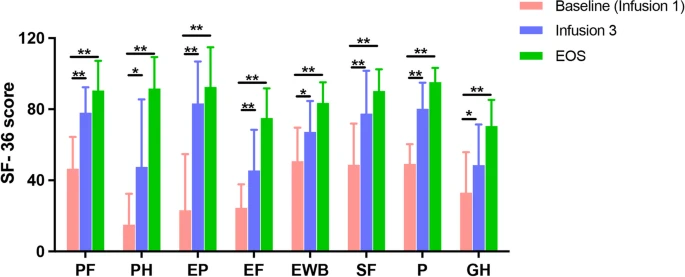 功效數(shù)據(jù)分析顯示,幾乎每種癥狀都有統(tǒng)計學(xué)上的顯著改善。我們發(fā)現(xiàn)所有個體SF-36量表(因身體機能而導(dǎo)致的角色限制;因身體健康而導(dǎo)致的角色限制;因情緒問題而導(dǎo)致的角色限制;精力/疲勞;情緒健康;社交功能;疼痛和總體健康狀況)均顯著增加)與基線相比,EOS水平有所提高,這意味著生活質(zhì)量得到改善。