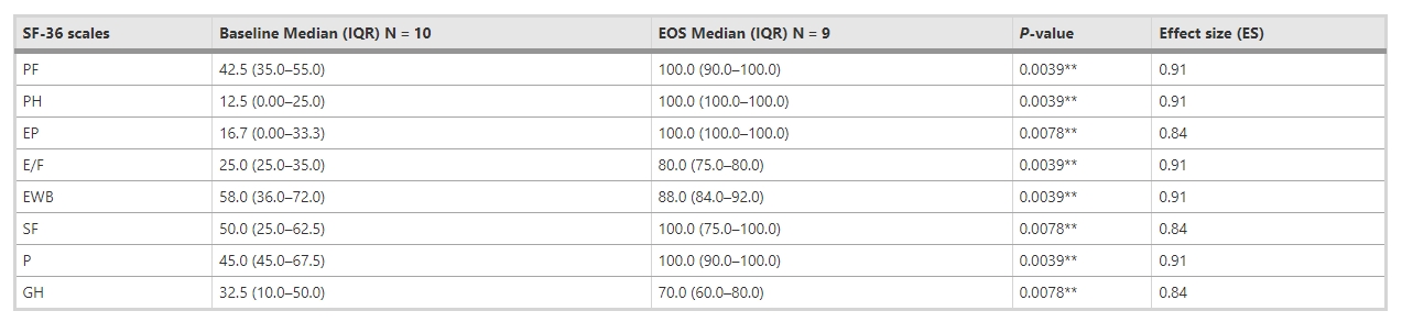 SF-36調(diào)查問卷:基線和EOS SF-36評分之間的配對比較顯示,生活質(zhì)量得到改善,個人SF-36評估發(fā)生顯著變化(圖3、表3)。