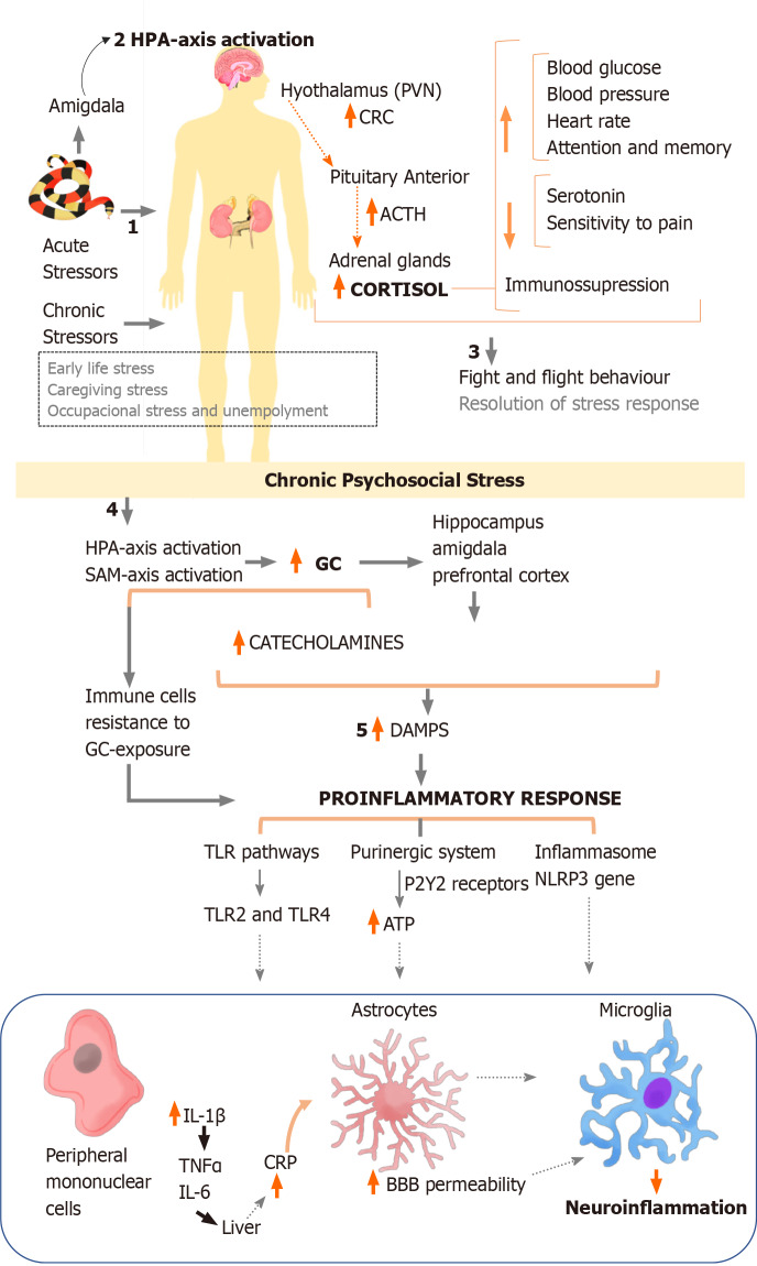除了引發(fā)戰(zhàn)斗或逃跑反應(yīng)外,壓力的特征還包括心率、血壓、皮質(zhì)醇和兒茶酚胺的增加。它還激活外周血單核細(xì)胞中的炎癥通路。然而,當(dāng)壓力暴露持續(xù)發(fā)生而沒有得到解決時,就會觸發(fā)代謝和生理反應(yīng),從而導(dǎo)致慢性炎癥狀態(tài)的形成。圖1根據(jù)之前的幾篇評論,顯示了壓力和神經(jīng)炎癥在抑郁癥發(fā)病機制中的關(guān)聯(lián)。
