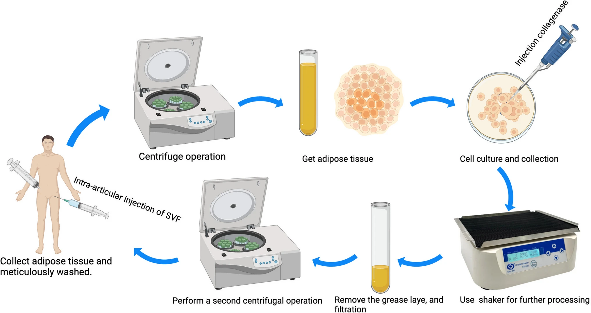 研究已明確證實(shí)了脂肪干細(xì)胞 (ADSC) 和間充質(zhì)干細(xì)胞 (MSC) 在骨關(guān)節(jié)炎 (OA) 治療中的安全性和有效性。然而,在設(shè)備齊全的實(shí)驗(yàn)室中,分離、培養(yǎng)和增殖這些干細(xì)胞類型通常需要數(shù)周時(shí)間,這可能會延長患者的治療時(shí)間。自體脂肪干細(xì)胞移植 (SVF) 被認(rèn)為是一種更有效的方法。此外,在應(yīng)用脂肪抽吸技術(shù)的過程中,脂肪組織中的膠原酶被激活,導(dǎo)致脂肪水解。