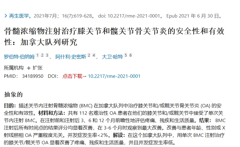 | 骨髓濃縮物注射治療膝關(guān)節(jié)和髖關(guān)節(jié)骨關(guān)節(jié)炎的安全性和有效性:加拿大隊(duì)列研究[111] | 伯納姆 | 加拿大 | 2021 | 臨床試驗(yàn) | 再生醫(yī)學(xué) | 112 | 關(guān)節(jié)內(nèi)注射骨髓濃縮物 | 婦女健康與醫(yī)療服務(wù)部 (WOMAC);VAS;HHS | 6個(gè)月 |
