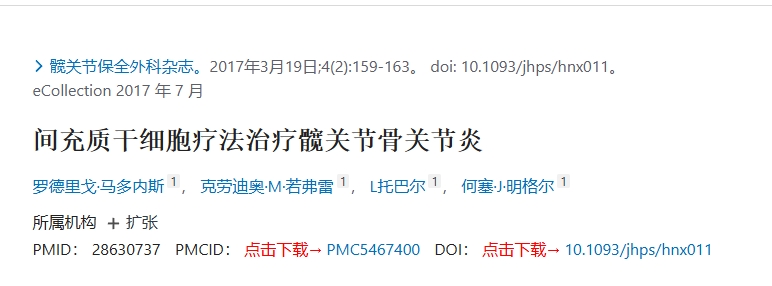 | 間充質(zhì)干細(xì)胞療法治療髖關(guān)節(jié)骨關(guān)節(jié)炎[109] | 馬多內(nèi)斯 | 智利 | 2017 | 臨床試驗(yàn) | 髖關(guān)節(jié)保全外科雜志 | 10 | 關(guān)節(jié)內(nèi)自體骨髓間充質(zhì)干細(xì)胞(BM-MSC)注射 | 哈里斯髖關(guān)節(jié)(HHS),視覺模擬(VAS),韋爾西安大略大學(xué)和麥克馬斯特大學(xué)骨關(guān)節(jié)炎指數(shù)(WOMAC) | 36個(gè)月 |