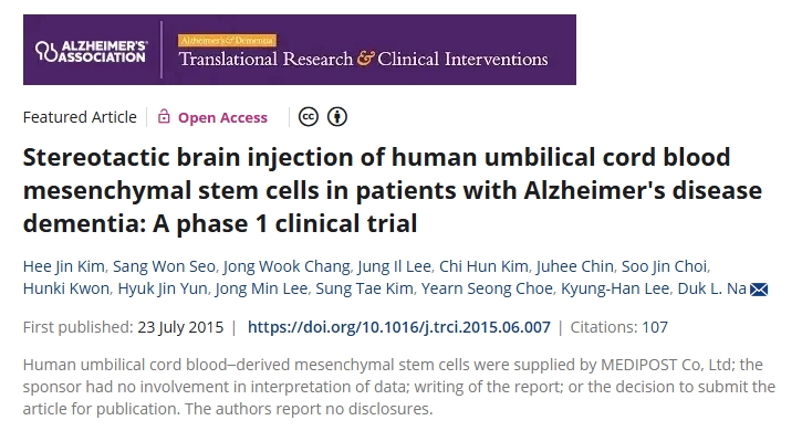 2015年:立體定向腦注射人臍血間充質(zhì)干細(xì)胞治療阿爾茨海默病癡呆患者:1期臨床試驗(yàn)