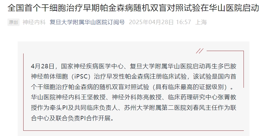 全國首個!華山醫(yī)院啟動干細(xì)胞治療早期帕金森病隨機(jī)雙盲對照試驗(yàn)