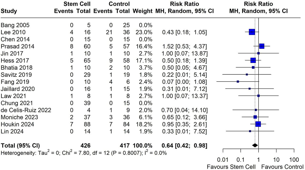 在安全性評估方面,結(jié)果顯示出積極信號。死亡率數(shù)據(jù)顯示,干細(xì)胞治療組的死亡風(fēng)險顯著低于對照組(圖3),相對危險度為0.64(95%CI 0.42至0.98, p=0.040),且各研究間無異質(zhì)性(I2=0%)。