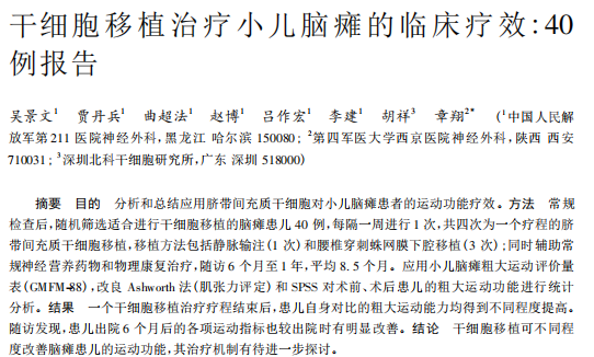 中國(guó)人民解放軍第211醫(yī)院神經(jīng)外科團(tuán)隊(duì)[2]對(duì)40例腦癱患兒進(jìn)行臍帶間充質(zhì)干細(xì)胞治療,療程結(jié)束后發(fā)現(xiàn),和患兒自身對(duì)比的粗大運(yùn)動(dòng)能力均得到不同程度提高,尤其是仰臥位與俯臥位、坐位、爬與跪、行走方面,跑跳功能方面也有明顯改善; 而且在患兒出院后6 個(gè)月至1 年期間內(nèi),仍能維持長(zhǎng)期的療效。同時(shí),干細(xì)胞移植治療也明顯降低患兒的肌張力。