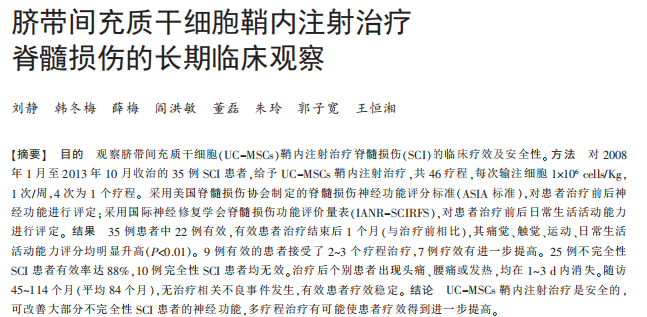2018年,空軍總醫(yī)院與北京放射與輻射醫(yī)學(xué)研究所公布了臍帶間充質(zhì)干細(xì)胞鞘內(nèi)注射治療脊髓損傷的長(zhǎng)期臨床觀察結(jié)果。22例有效SCI患者接受臍帶間充質(zhì)鞘內(nèi)注射治療,結(jié)果表明UC-MSCs鞘內(nèi)注射治療是安全的,可改善大部分不完全性SCI患者的神經(jīng)功能,多療程治療有可能使患者療效得到進(jìn)一步提高