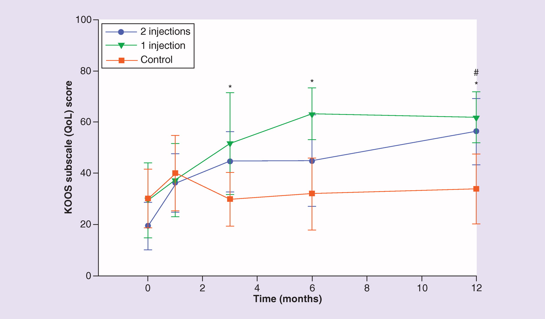 根據(jù)NPRS測量,一次注射組和兩次注射組的疼痛在完成時(shí)分別從6.7 (1.7) 和6.5 (1.4) 的平均值(標(biāo)準(zhǔn)差)改善到2.6 (1.8) 和2.3 (2)的研究。在單次注射方案治療組和兩次注射方案治療組中,與基線相比,組內(nèi)改善在所有時(shí)間點(diǎn)均具有統(tǒng)計(jì)學(xué)意義(圖2)。同樣,組間差異顯示,與對照組相比,單次注射組和兩次注射組在12個(gè)月時(shí)的疼痛明顯減輕(圖2)。兩個(gè)治療組之間沒有發(fā)現(xiàn)顯著差異。