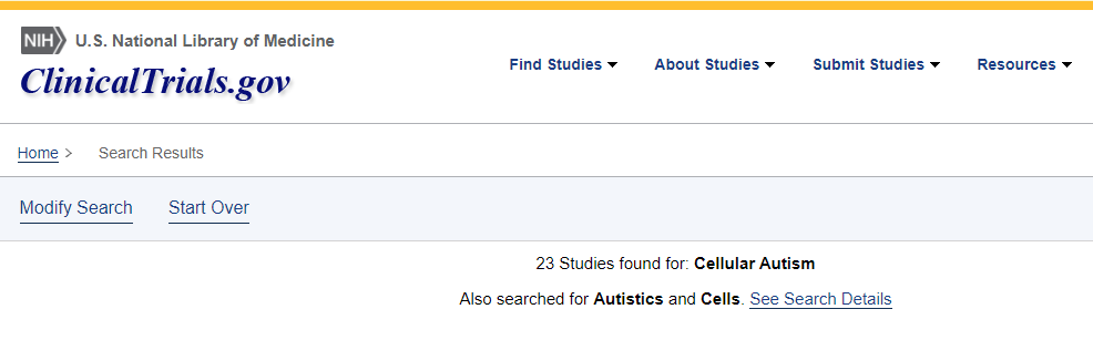 2023年5月,使用搜索詞 “自閉癥譜系障礙和細(xì)胞療法 “對(duì)美國NIH臨床試驗(yàn)數(shù)據(jù)庫(clinicaltrials.gov)進(jìn)行了搜索,發(fā)現(xiàn)了23項(xiàng)。