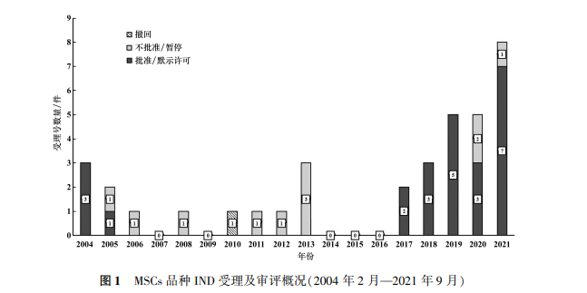 除特別審批品種以外,2004年2月—2020年12月,國(guó)家藥品監(jiān)督管理局藥品審評(píng)中心受理MSCs產(chǎn)品的注冊(cè)申請(qǐng)有36件(以受理號(hào)計(jì)),共計(jì)27個(gè)品種[1],均為新藥(investigational new drug application,IND) 臨床試驗(yàn)的申請(qǐng),目前尚無干細(xì)胞產(chǎn)品批準(zhǔn)上市。 MSCs品種在各個(gè)年份的申請(qǐng)數(shù)量及審評(píng)結(jié)局見圖1。雖然近10余年,我國(guó)的干細(xì)胞臨床研究數(shù)量總體是穩(wěn)步增加的[2],但按照藥品申報(bào)的MSCs品種的數(shù)量受國(guó)家頒布的細(xì)胞治療相關(guān)政策法規(guī)和技術(shù)發(fā)展的影響,呈現(xiàn)波動(dòng)式增長(zhǎng)。