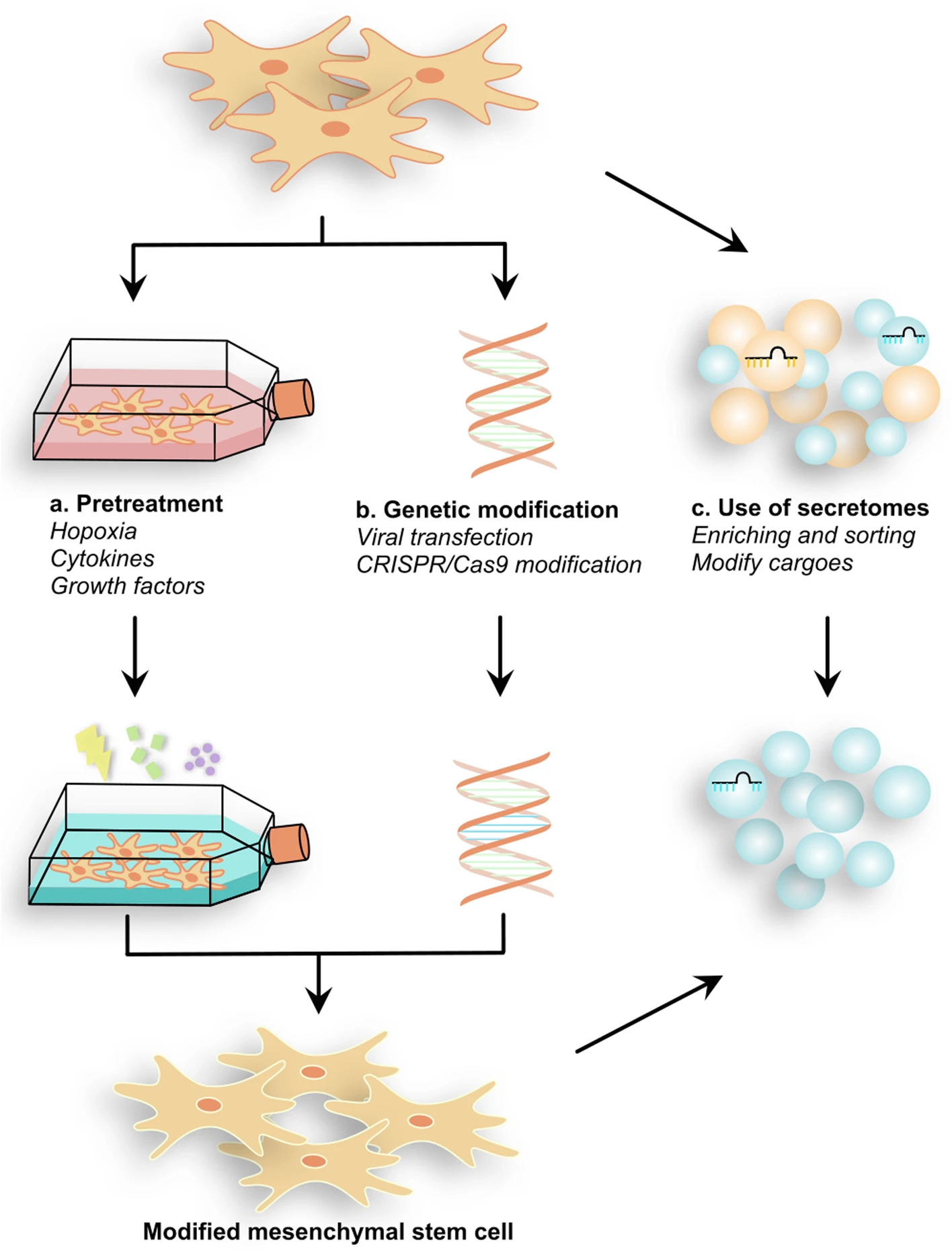 除了我們之前關(guān)于改良間充質(zhì)干細胞有益于肝纖維化和肝癌的研究外,改良間充質(zhì)干細胞療法在治療其他肝病方面也被認為是有效的。目前,出現(xiàn)了更精確的修飾方法來增強間充質(zhì)干細胞的作用。這些策略可能涉及間充質(zhì)干細胞的啟動、間充質(zhì)干細胞的基因修飾或間充質(zhì)干細胞分泌物的使用(圖2)。