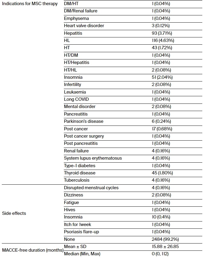 不良反應(yīng):大多數(shù)接受MSC治療的患者(n=2484,99.2%)沒有出現(xiàn)任何不良反應(yīng)(表1)。最常見的不良反應(yīng)是失眠(n=10,0.4%),其次是月經(jīng)紊亂(n=4,0.16%)和頭暈(n=2,0.08%)。重要的是,這些不良反應(yīng)都不是嚴(yán)重的。