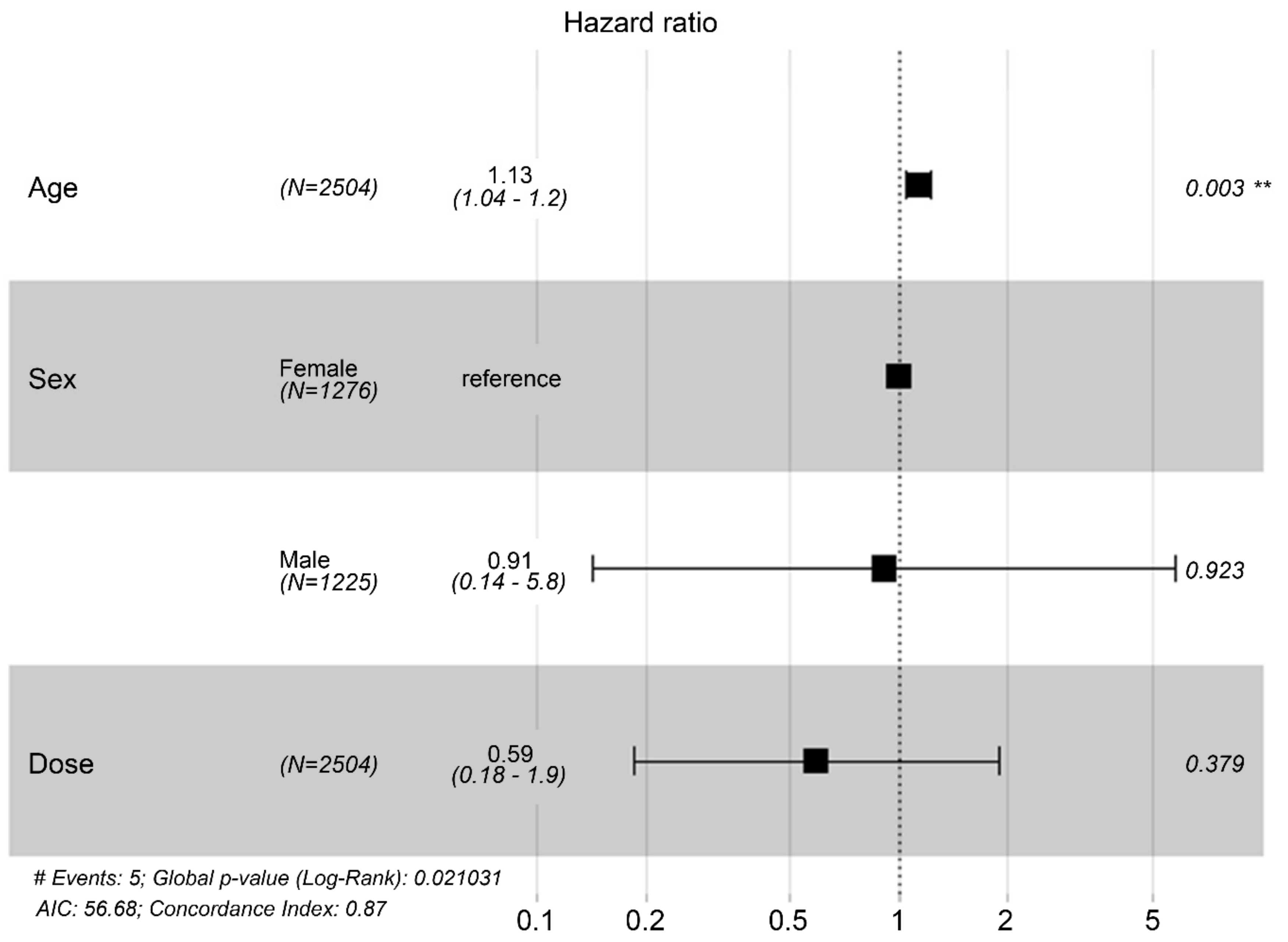 在平均112個月的觀察期內(nèi),共有5例重大不良心腦血管事件和死亡(標(biāo)準(zhǔn)誤差=0.435;表2和圖1),包括4例死亡(1例死于2019冠狀病毒病相關(guān)肺炎,1例死于無關(guān)事件,1例死于自然原因[老齡],1例死于中風(fēng))和1例非致命性中風(fēng)。這意味著隨訪期間的MACCE發(fā)生率為0.20%。在單變量Cox比例風(fēng)險回歸分析中,對年齡、性別和MSC劑量的分析顯示,只有年齡與重大不良心腦血管事件風(fēng)險顯著相關(guān)(表3)。