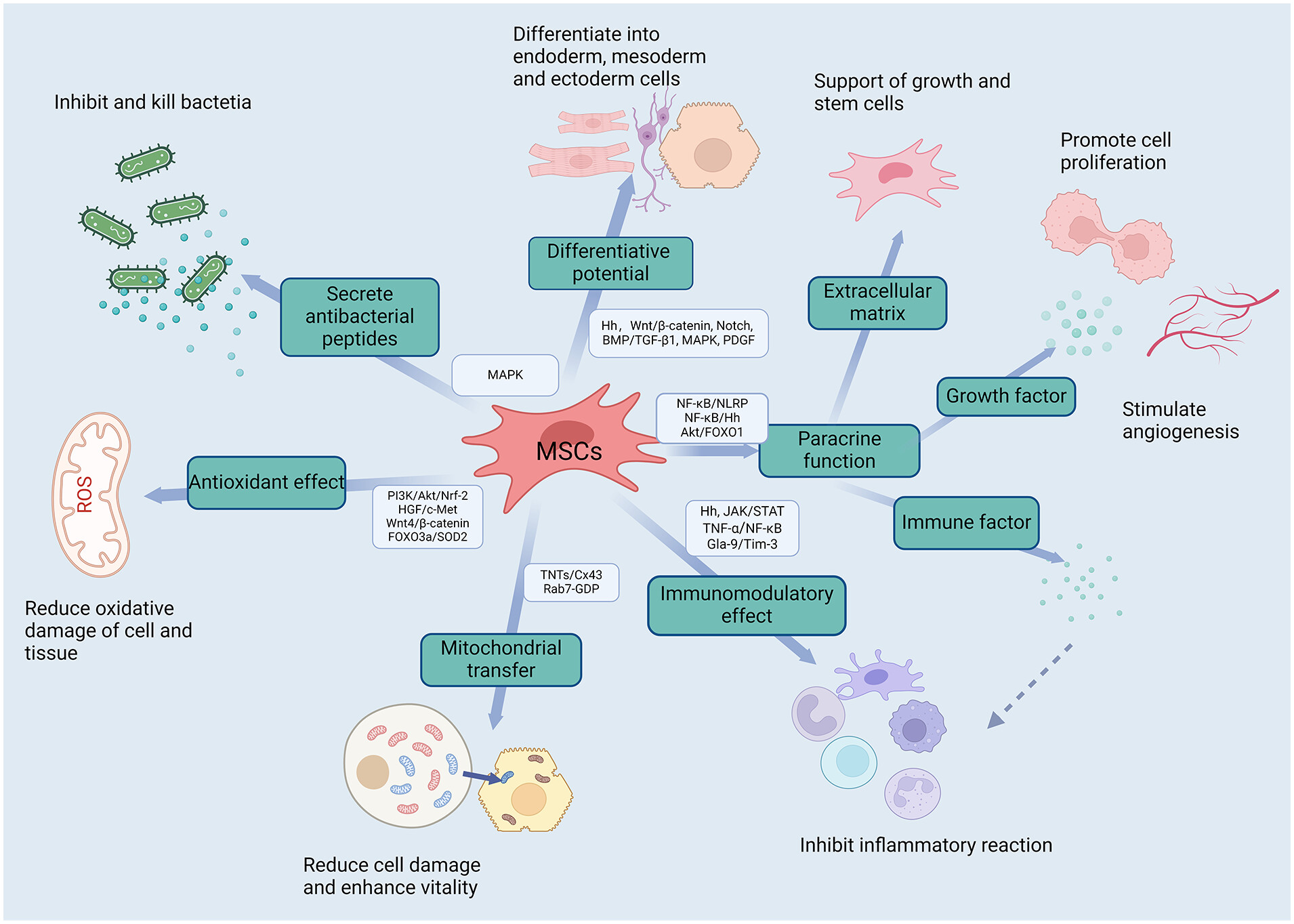 圖2:多能間充質(zhì)干細(xì)胞通過(guò)多種治療機(jī)制在疾病中發(fā)揮治療作用,其中涉及多種信號(hào)通路