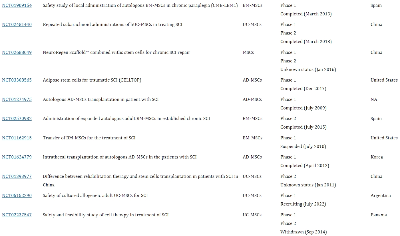 - 骨髓間充質(zhì)干細(xì)胞(BM-MSC):2008年Geffner等人臨床試驗(yàn)(NCT01909154)證明,多種途徑給予BM-MSC對(duì)多種脊髓損傷安全可行,可改善患者生活質(zhì)量。
