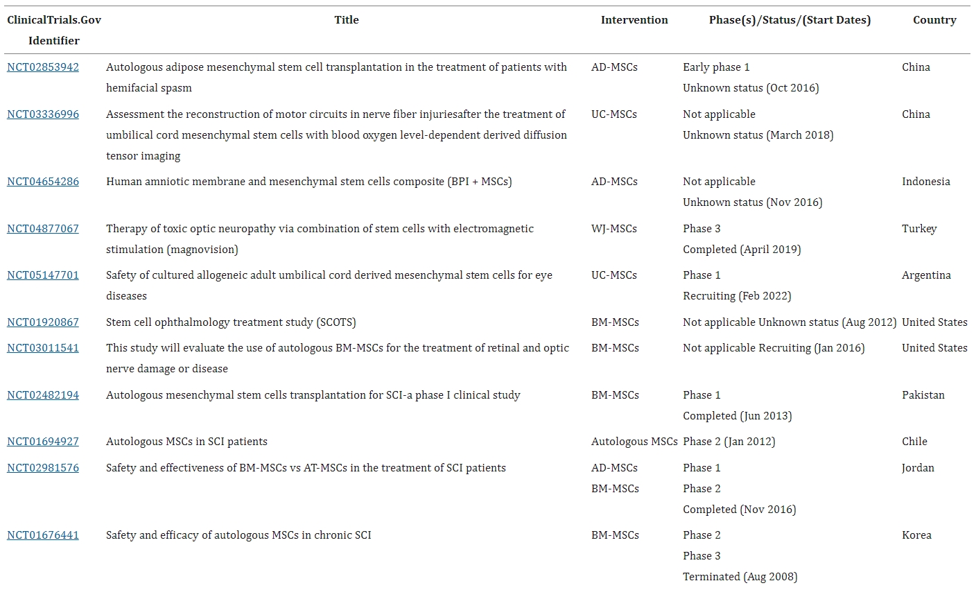 截至今天(2024年12月23日),公共臨床試驗(yàn)數(shù)據(jù)庫 ( ClinicalTrials.gov ) 中已注冊(cè)7項(xiàng)使用間充質(zhì)干細(xì)胞治療神經(jīng)損傷的試驗(yàn)和32項(xiàng)使用間充質(zhì)干細(xì)胞治療脊髓損傷的試驗(yàn)(表2)。