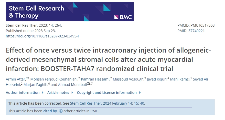 2023年,期刊《Stem Cell Research&Therapy》刊發(fā)一篇有關(guān)“急性心肌梗死后冠狀動脈內(nèi)注射一次與兩次同種異體來源的間充質(zhì)基質(zhì)細(xì)胞的效果:BOOSTER-TAHA7隨機(jī)臨床試驗(yàn)[2]。