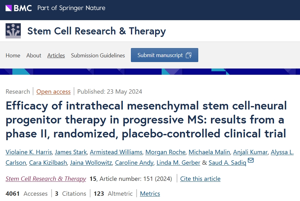 2024年,國際期刊雜志《干細(xì)胞研究與治療》發(fā)表了一篇“鞘內(nèi)間充質(zhì)干細(xì)胞-神經(jīng)祖細(xì)胞治療進(jìn)展型多發(fā)性硬化癥的療效:II期隨機(jī)安慰劑對照臨床試驗(yàn)結(jié)”的文章。