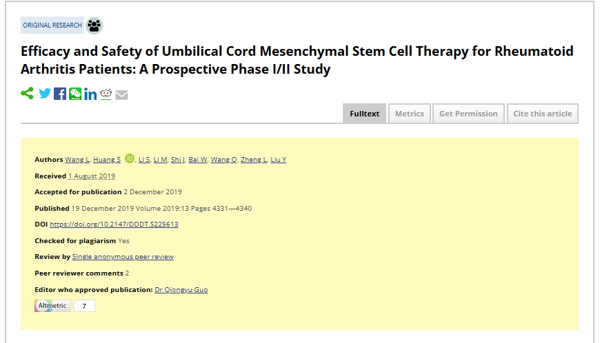 治療期間,患者在輸注100mL生理鹽水后立即通過靜脈注,40mLUC-MSC懸浮產(chǎn)品(2×10^7細(xì)胞/20mL)。使用血清學(xué)標(biāo)志物測試來評估安全性,使用28關(guān)節(jié)疾病活動(dòng)評分 (DAS28) 和健康評估問卷 (HAQ) 來評估UC-MSCs治療RA的長期效果和安全性。研究結(jié)果發(fā)表在《Dove Press》。