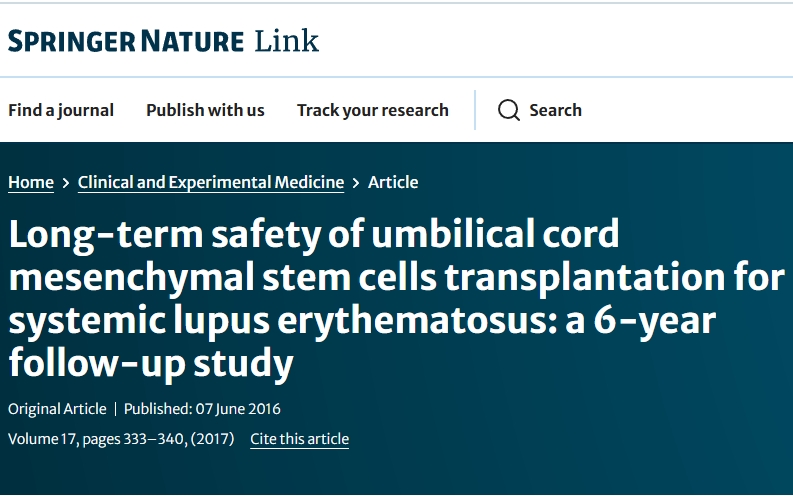 2016年,國際期刊雜志《臨床與實(shí)驗(yàn)醫(yī)學(xué)》發(fā)表了一篇“臍帶間充質(zhì)干細(xì)胞移植治療系統(tǒng)性紅斑狼瘡的長期安全性:6年隨訪研究”的文章。