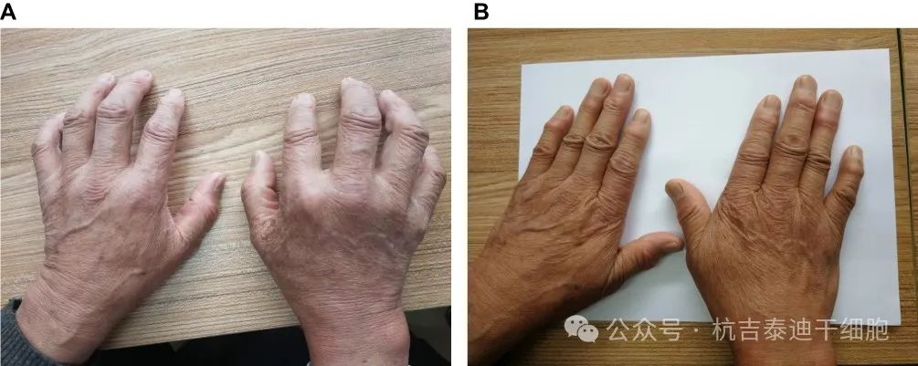 第一位患者是一位68歲的男性,治療前關(guān)節(jié)疼痛、腫脹、變形嚴(yán)重,接受UC-MSC治療6個(gè)月后癥狀得到緩解,并維持至治療后3年(圖1A)。接受UC-MSC治療3年后,關(guān)節(jié)變形得到恢復(fù)(圖1B),疼痛也消失了,并且能夠自由活動(dòng)和進(jìn)行一些體育鍛煉。