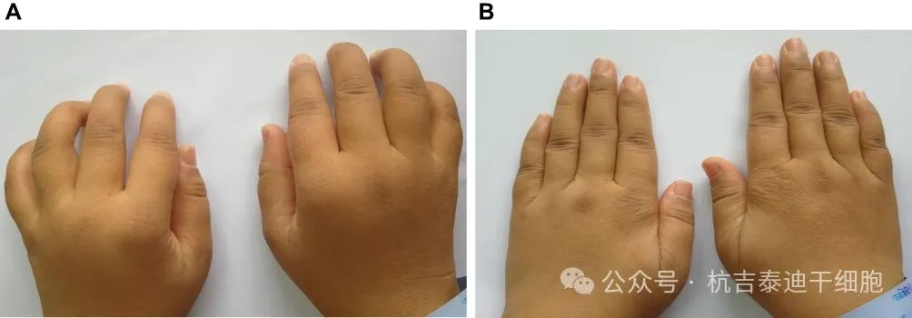 另一名33歲女性類風(fēng)濕性關(guān)節(jié)炎患者,治療前關(guān)節(jié)腫脹及畸形較為嚴(yán)重(圖2A),治療后病情也獲得緩解。接受UC-MSC治療三年后,其關(guān)節(jié)畸形得到改善(圖2B),腫脹也得到較好的緩解。此外,她現(xiàn)在有時(shí)可以自由奔跑和進(jìn)行一些體育鍛煉。