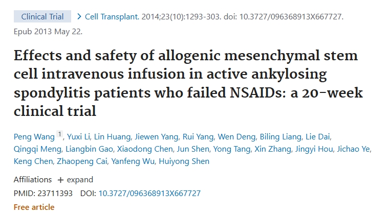 同種異體間充質(zhì)干細(xì)胞靜脈輸注對(duì)非甾體抗炎藥治療失敗的活動(dòng)性強(qiáng)直性脊柱炎患者的療效和安全性:一項(xiàng)為期20周的臨床試驗(yàn)