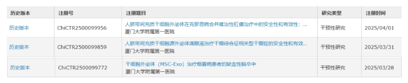 臨床進(jìn)展與挑戰(zhàn):多項(xiàng)臨床試驗(yàn)驗(yàn)證了MSCs在瘺管性CD中的療效,局部注射(如腸壁或瘺管部位)效果顯著,而靜脈輸注亦顯示系統(tǒng)性抗炎作用。此外,近期,廈門大學(xué)第一附屬醫(yī)院宣布啟動(dòng)三項(xiàng)創(chuàng)新性臨床試驗(yàn),探索間充質(zhì)干細(xì)胞外泌體在腦卒中、干眼癥、克羅恩病等難治性疾病中的應(yīng)用,為患者帶來(lái)全新治療選擇。